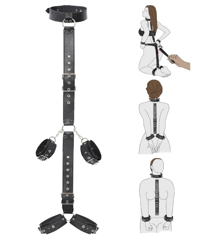 • Sistema de Restricción Integral: El diseño conecta un collar ajustable con esposas para muñecas y tobillos a través de una correa central robusta, manteniendo el cuerpo en posiciones de vulnerabilidad y entrega absoluta.