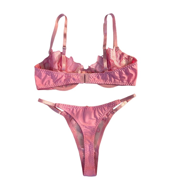 El conjunto ileana rosa de sostén con aros y colaless combina transparencias suaves con bordados florales que realzan tu lado más femenino y elegante.