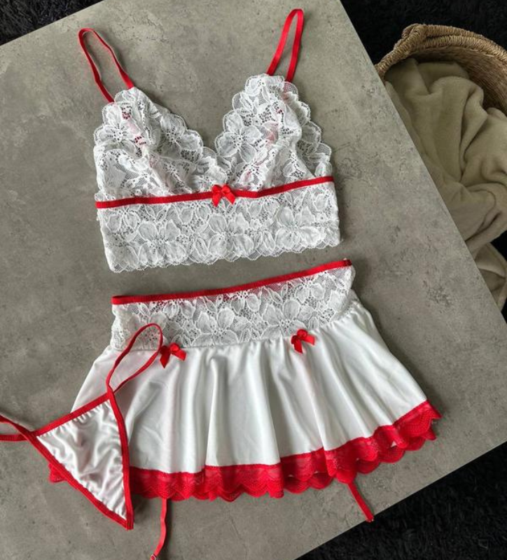 Disfraz de caperucita lencería sexy, se acopla a tu cuerpo y moldea tu figura. Incluye 4 piezas. Sostén triangulo, pollerita,