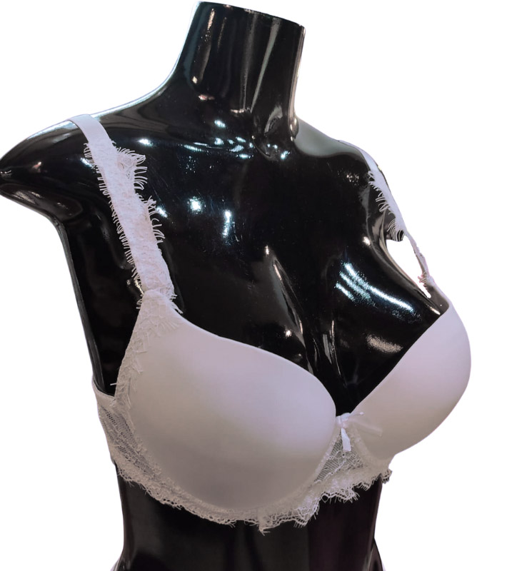 Bralette confeccionado en guipur en el frente y elástico liso en espalda, con taza soft triangulo Color marrón, rosa, azul,