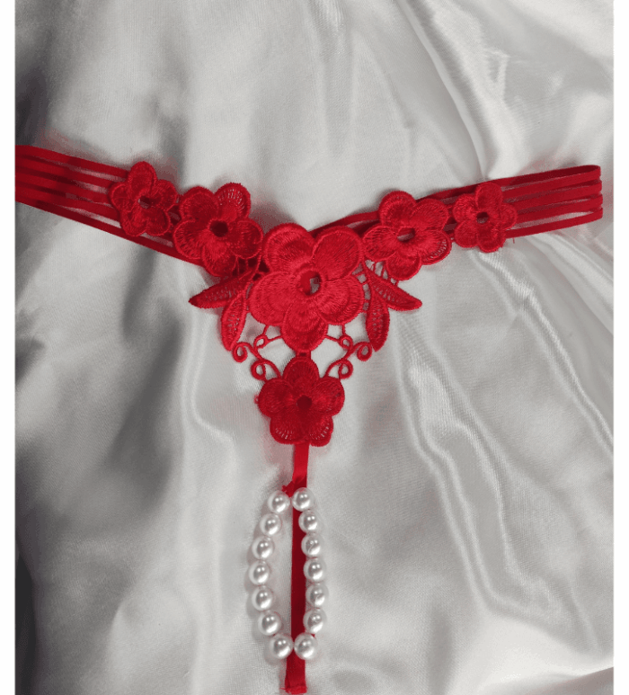 Tanga en color rojo con detalle de perlitas y encaje floreado.