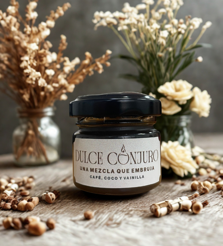 Enciende el deseo con Dulce Conjuro, una vela aromática diseñada para despertar fantasías y crear atmósferas irresistibles. Su combinación hipnótica de café, coco y vainilla envuelve el ambiente con una calidez dulce y sensual que invita al placer y la conexión íntima.